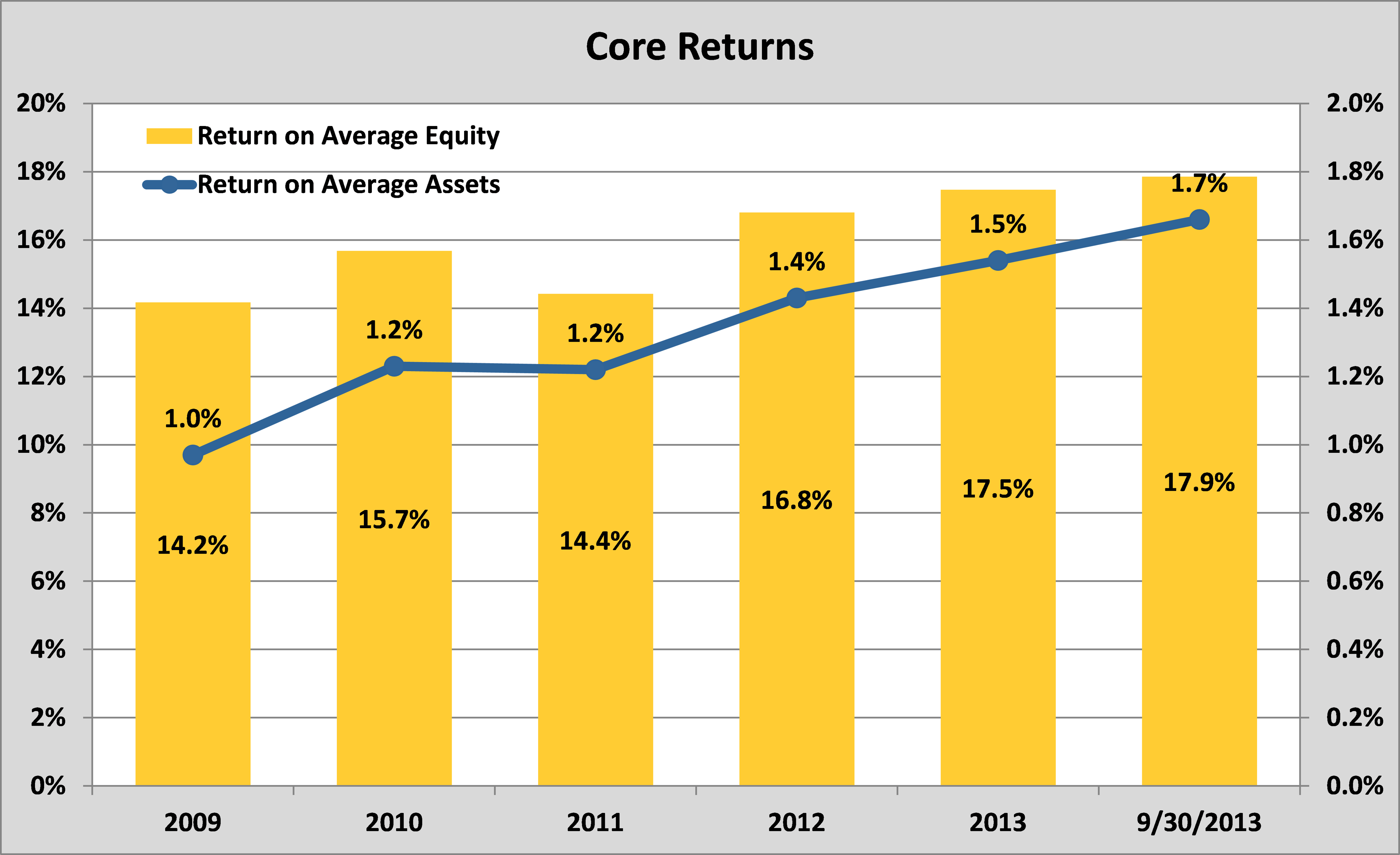 Thanks to its impressive growth on its balance sheet, BofI Holding has also delivered strong growth in its margins, and so far, 2013 has proved to be no exception. BofI ends its fiscal year in June, and its yearly return on average assets and equity, excluding one-time items, is available in the chart below: