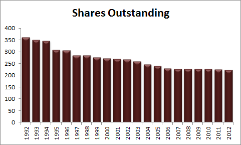 Moreover, Hershey compounds the effect by continually lowering its share count. Although the company has not repurchased a significant number of shares since the financial crisis, the long-term trend shows that Hershey is devoted to reducing the share count over time.