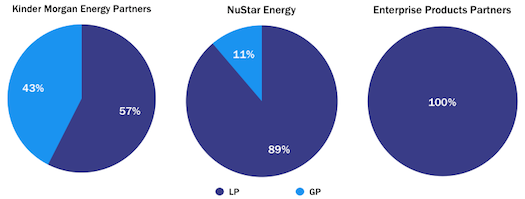 Kinder Morgan is clearly in the high splits, handing plenty of cash over to its general partner via IDRs. KMP declared $434 million for Kinder Morgan, Inc (KMI 2.42%) in the third quarter, while paying its limited partners $587 million. As the charts show, that was not the case at NuStar, and certainly not the case at Enterprise Products Partners, which bought out the economic interest of its general partner in 2010 and does not pay incentive distribution rights at all.