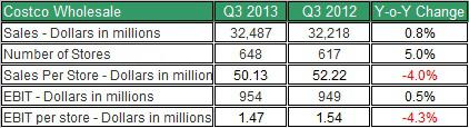 Costco , much like Wal-Mart, had a moderate increase in sales -- a 0.8% gain -- but a relatively high gain in new stores -- a 5% increase. In total, the company's sales per store declined by 4%. Finally, Costco's operating profit per store also declined by a similar rate.