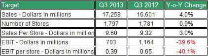 The table below shows Target's third-quarter sales, operating profit, and number of stores. The company's revenue rose by 4% and its average store sales by 3%. Nonetheless, Target's operating profit declined by roughly 40%. This means Target has managed to improve its sales per store but not its operating profit.