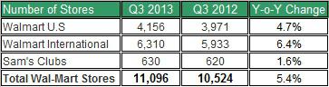 Finally, at first glance, the company's growth in sales in the U.S was higher than that of U.S general-merchandise-stores sales -- another positive sign that Wal-Mart has outperformed the market. But a closer examination reveals that most of the growth is related to opening new stores. The table below summarizes the change in the number of stores in the past quarter.
