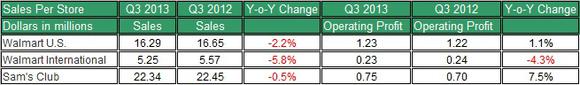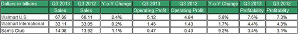 During the third-quarter, Wal-Mart's sales increased by 1.6%. Moreover, its operating profit rose by 3.6%. The table below breaks down the company's three main business segments: U.S, international and Sam's club.