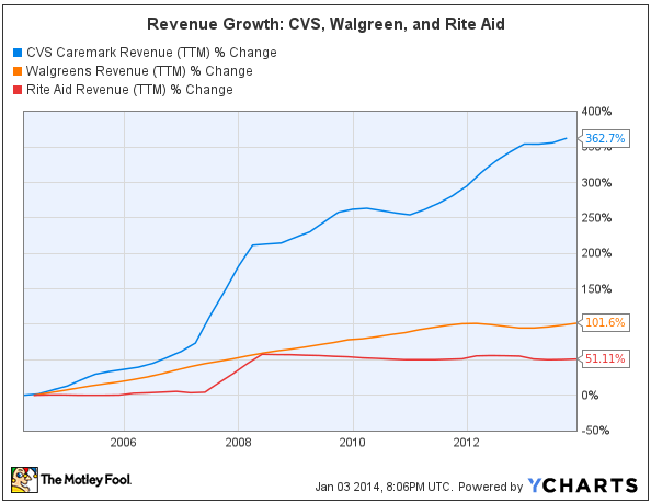 CVS has outgrown competitors like Walgreen and Rite Aid by a wide margin over the last 10 years, and the company has superior profit margins in the area of 6.4% at the operating level versus operating margins near 5.1% for Walgreen, and 3.9% for Rite Aid.