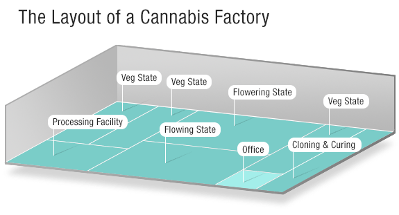 The most important is the third stage, during which a plant flowers and thereby produces the buds that are then sold to customers. For 50 to 75 days, the by-now three-foot-high plant is switched to 12-hour light cycles under sodium lights. The softer, reddish tint of the bulbs, as well as the cycle itself, mimics the fall season, and in doing so signals to the plant that it's time to bud. The fourth and fifth stages, meanwhile, consist of processing the plant and then curing the saleable products by allowing them to dry out on tiered screens. Altogether, a good facility should be able to complete five full cycles like this a year.