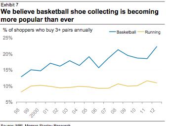 Athletic footwear is becoming increasingly collectible and more popular than ever. A Morgan Stanley study has shown that the percentage of shoppers who buy 3 or more pairs of basketball shoes annually is around 22%, an increase from around 13% in 1998.