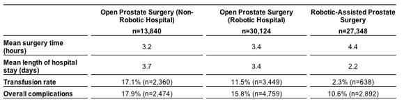 As you can see below, the robotic-assisted surgeries -- on the far right -- might have taken longer to complete, but they resulted in a 40% shorter hospital stay and far fewer instances of transfusions and overall complications.