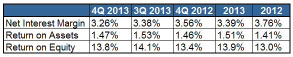 Wells Fargo did see its profit margins dip slightly in the fourth quarter relative to the third thanks to a more challenging rate environment as shown in the chart below. However, the results were favorable when comparing the full year and also the fourth quarter of 2013 relative to the fourth quarter of 2012: