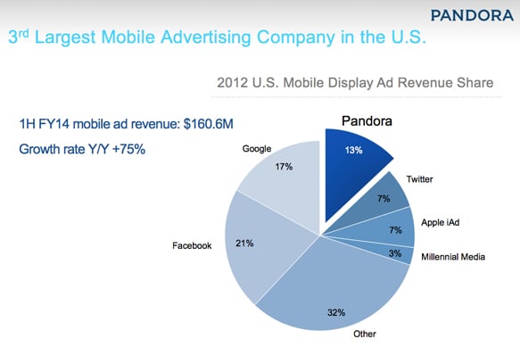 Unfortunately, this process is very expensive. More importantly, other players in the Internet radio space, like Apple (AAPL 0.05%) with its iTunes Radio, Sirius XM, and Spotify offer similar services. These competitors may not provide a state-of-the-art music recommendation service, but may have larger libraries of albums, offsetting Pandora's competitive advantages. Finally, because Pandora uses a business model based on digital ads, it also has to compete with advertising giants like Google (GOOG 1.12%) and Yahoo!.