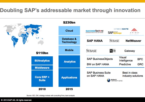 The good thing is that the company plans to increase sales to at least $30 billion by 2017. With revenue for 2013 coming in at $22.7 billion, the company has three years to increase its top line by more than $7 billion. This target is quite ambitious. Oracle (ORCL 0.71%) has acquired several competitors of SAP in order to build a solid portfolio of enterprise resource planning, or ERP, software. And cloud players such as Workday (WDAY +0.08%) continue capturing market share due to their low fees. In this difficult context, how does SAP plan to increase its revenue to $30 billion in three years?