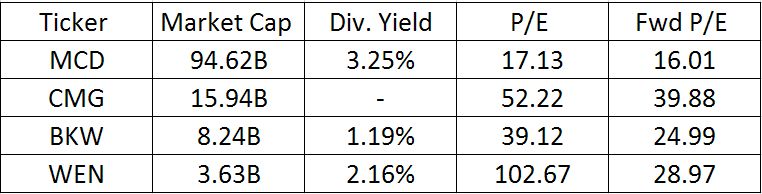 Comparing valuation levels for McDonald's versus Chipotle, Burger King, and Wendy's, it's easy to see that the company is priced at a significant discount to its peers. McDonald's is cheaper than its competitors when looking at P/E ratios, forward P/E levels, and dividend yield, so the market is pricing McDonald's for slower growth.