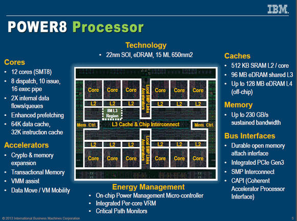 In terms of raw performance per core and per chip, thanks to some pretty beefy designs as well as a rather liberal thermal envelope, IBM's POWER 8 – when it shows up in systems likely later this year – is set to be a performance beast. This makes sense, particularly given how strong the current generation POWER 7+ chips are in a number of industry-standard benchmarks such as SPEC and given the rather substantial improvements that IBM has put into POWER 8.