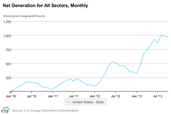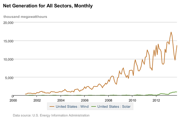 Since 2007, electricity generation from coal has fallen 24.9% from 2.02 billion MW-hrs to 1.51 billion MW-hrs in 2012. Meanwhile, over the same time frame wind grew 309% to 140.8 million MW-hrs and solar grew 607% to 4.3 million MW-hrs. That doesn't include distributed solar on residential rooftops or any installations from 2013, which was a record year for solar, installing about 4.4 GW in the U.S.