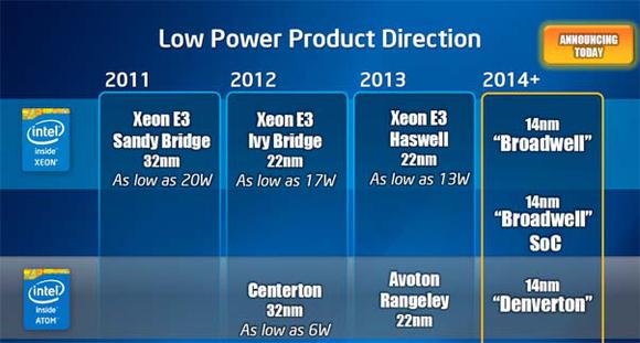 Note that the Atom C2750 has been shipping and available for purchase since late 2013, while AMD's part won't be available until late 2014 (it begins sampling in March). This means that Intel could sit back and not bother to release a next-generation part and still have a performance/watt advantage. Unfortunately for AMD, though, Intel plans to release not just one, but two new parts for this space, built on its next-generation "Broadwell" and "Airmont" processor cores, in late 2014.
