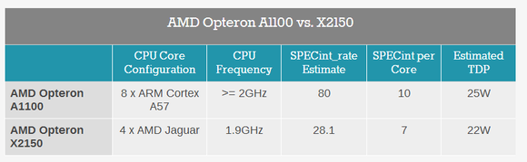 The upcoming ARM-based Opteron A1100 scores 80 in SPECint_rate, an industry standard CPU benchmark that often informs the decisions of server buyers. Note that this performance is achieved in a 25W power envelope (according to AMD's TDP rating).