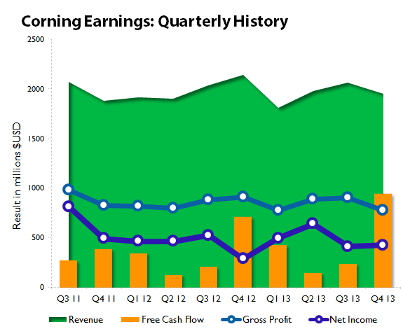 However, the company warned that prices on large display panels for TV sets would suffer further erosion in 2014 -- analyst Steven Fox of Cross Research anticipated a sequential price decline of as much as 6% in the current quarter. As display glass sales were already down 5% year over year in the fourth quarter, and with Corning anticipating display glass volume to decline in the first-quarter, this unwelcome information sent investors skittering for the exits. Shares ended up roughly 6% lower by the close yesterday. If you look at Corning's financial performance on a longer timeline, you might better understand why that happened: