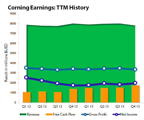 What's more interesting is the upward momentum in Corning's free cash flow, which was up 83% from the end of 2011 to the end of 2012, and up again another 33% for 2013 against 2012's result. This could actually be somewhat worrisome for Corning shareholders, as the company's capital expenditures were almost $200 million less in the fourth quarter of 2013 as compared to the year-ago period. On a full-year basis, Corning spent about $800 million less in capital expenditures in 2013 than it did in 2012. Since Corning has not shown much in the way of long-term progress, except on its free cash flow metric, this isn't an encouraging sign of imminent growth. Its trailing 12-month history shows a company that's been largely stuck in neutral:
