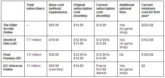 Let's compare that to several of the top MMOs on the market today -- Activision Blizzard's (ATVI +0.00%) World of Warcraft, Square Enix's Final Fantasy XIV: A Realm Reborn, and Sony/WB Games' DC Universe Online -- for a clearer comparison.