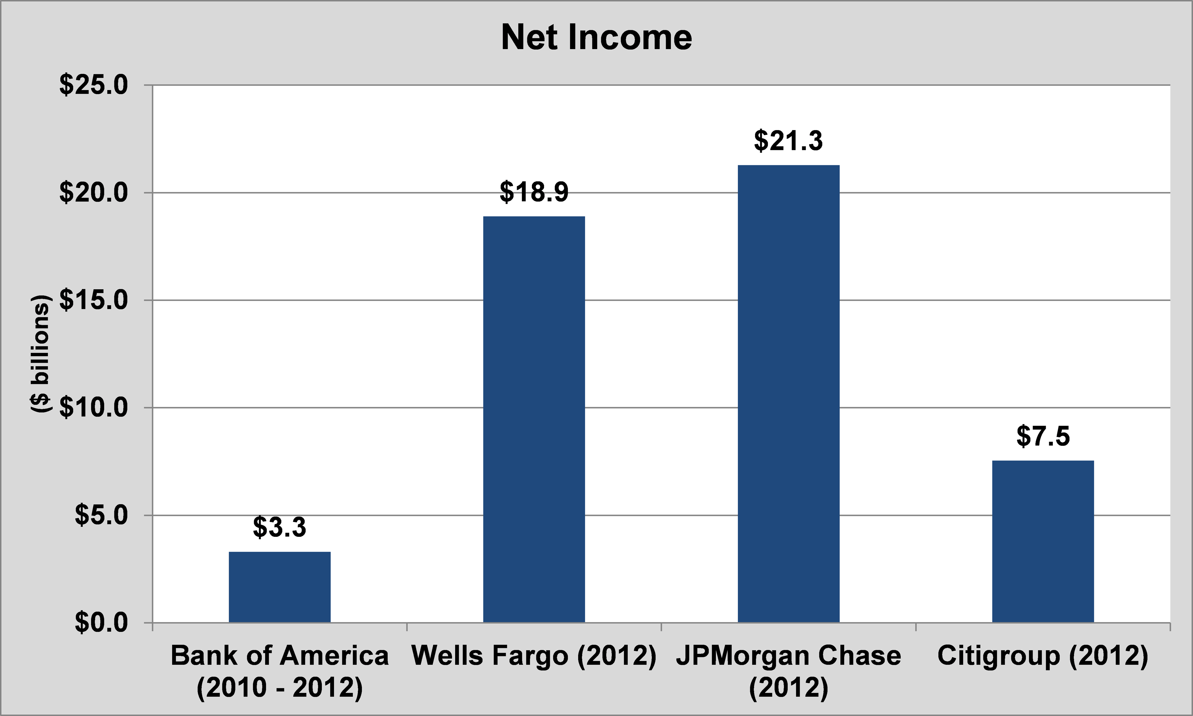 Even more striking was the reality that in the five combined years from 2008 to 2012, Bank of America had $13.6 billion of total net income, which was less than what JPMorgan Chase and Wells Fargo reported in 2012 alone. In fact, if you look at the three years from 2010 to 2012, the difference is even more startling.