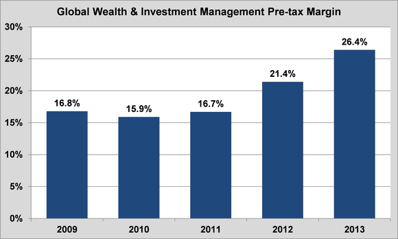 But beyond its consumer and corporate operations is its Global Wealth and Investment Management business -- which contains the Merrill Lynch and U.S. Trust brands -- that delivered $3 billion in net income to the bank in 2013. Impressively, this is well ahead of both JPMorgan Chase (JPM +0.26%) and Wells Fargo (WFC 0.29%) on a raw dollar, percent of income, and growth basis: