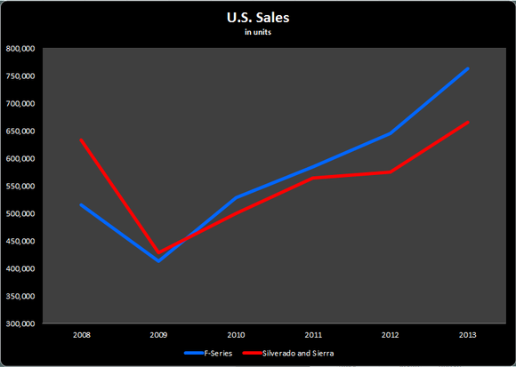 It's clear that two factors have given Ford more of a lead than usual, over the last few years. First, the fact that General Motors filed for bankruptcy and received unusual treatment during the process has definitely hurt its image. The nickname "Government Motors" will certainly outlive the government's ownership of the company, which has already come to an end. Second, GM's two trucks were long overdue for a makeover and were getting beat in sales due to the late refresh. The bad news for GM fans is that the all-new designs that hit the showroom in mid-2013 aren't taking advantage of the small window of opportunity before Ford's next-generation F-150 goes on sale later this year.
