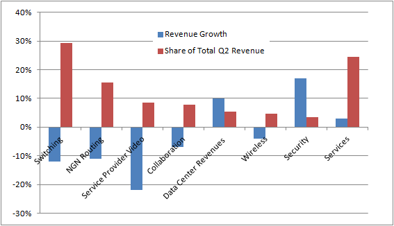A quick look at Cisco' segmental revenue growth in the quarter reveals the extent of the problems. Below, the red lines represent the segment's share of revenue in the quarter and demonstrate that the core segments are among those performing the weakest.