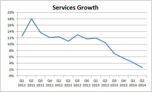 In addition, growth in wireless and data center revenue has weakened too, and security's strong growth is partly due to the completion of its acquisition of Sourcefire in 2013. In short, none of Cisco's product segments put in a particularly strong performance. Similarly, its services growth is coming into doubt.