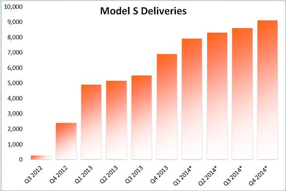 Source:Tesla press releases. * indicates quarterly estimate based on a scenario if Tesla hits 800 deliveries per week by late 2014.