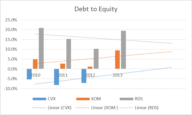 Of course, with spending rising across the board oil majors are reporting rising levels of debt, despite their already robust cash flows. The chart below shows the net debt-to-equity levels of Chevron, Exxon, and Shell during the last four years and projections for the next two years.
