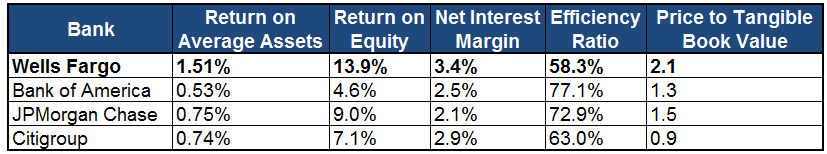 Yet perhaps the most impressive results was seen at Wells Fargo, which reported its highest annual profit ever, and it broke its quarterly net income record for the 11th quarter in a row. In total, net income at Wells Fargo rose from $18.9 billion to $21.9 billion, a gain of 16%. And it once again bested its four peers in every major pertinent profit metric, showing why it commands a premium valuation: