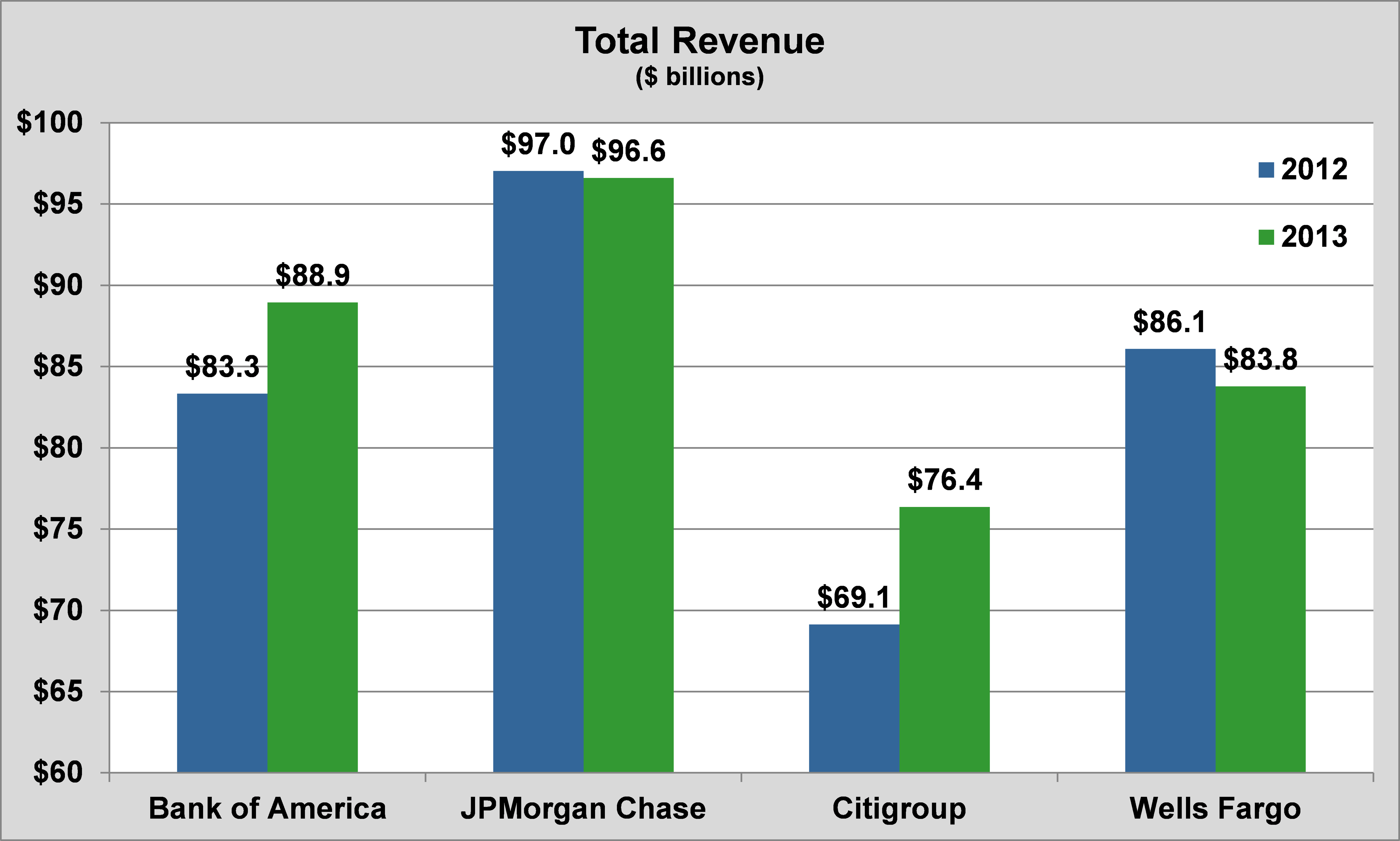 As you can see, Bank of America and Citigroup delivered impressive revenue growth year over year, with 7% and 11% gains, respectively, and JPMorgan Chase saw its drop slightly. However the revenue at Wells Fargo dipped by 3%, placing it well behind the trend seen by its biggest peers.