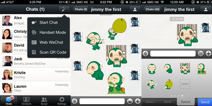 WeChat, which is free, offers more features than WhatsApp, which costs $0.99 per year.