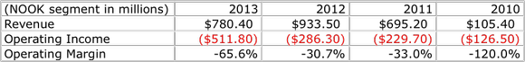Between 2010 and 2012, the company's NOOK segment grew revenue from $105.4 million to $933.5 million as e-book-hungry consumers gobbled up the device. But in the face of competition from Amazon.com's Kindle and Apple's iPad, the segment's revenue fell 16% to $780.4 million by the end of its 2013 fiscal year.