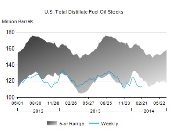 Distillates supplies, which include diesel and heating oil, expanded 0.3 million barrels (0.4%), exactly offsetting the previous week's draw. Distillates demand for the past four weeks is down a seasonally adjusted 0.1%. In the past year, distillates inventories have shrunk 8.9%.