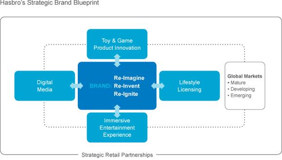 Not only has Hasbro been diversifying its physical merchandise, it's embracing a digital future for play. It has a 70% stake in Backflip Studios, the maker of Paper Toss and NinJump. The company states on its site that it "aims to deliver immersive brand experiences that children and families around the world can enjoy anytime and anywhere, in a variety of forms and formats." It has even integrated digital gaming into its strategic plan.
