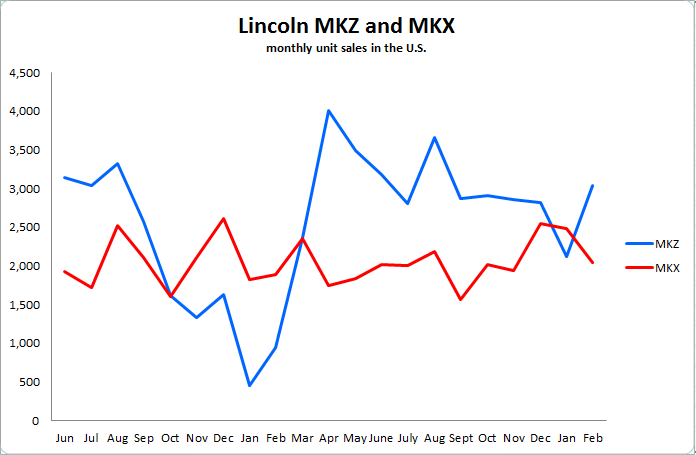 Sales of the MKZ were up a staggering 222% compared to last year, although that's more than explained by the model's botched January 2013 launch. Dealers had to wait months to get needed MKZ inventory which, as you can see above, sent sales plunging. Now that the pent-up demand has been worked through look for sales of the MKZ to stabilize and remain strong heading into the spring selling months. That will keep overall sales of the Lincoln lineup strong until the MKC hits dealerships, which should take the brand's sales to another level.