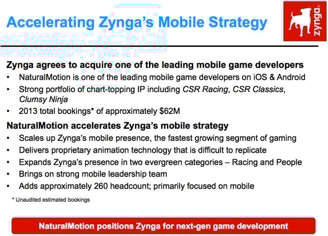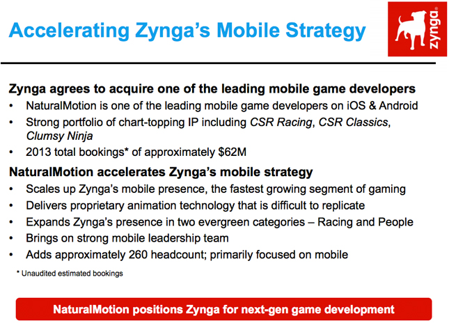 In order to accelerate its mobile strategy, Mattrick decided to acquire mobile gaming studio NaturalMotion for $527 million on Jan. 30. With the acquisition of NaturalMotion, Zynga is getting 12 years of experience in building sophisticated tools for mobile gaming.