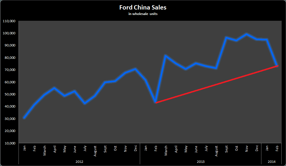 Ford's sales last month in China reached 73,040 units, which was an impressive 67% growth over last year's figures. While it was a sequential decline, investors must keep in mind that seasonality plays a large role in the automotive industry and the rightful comparison is indeed to February of last year.