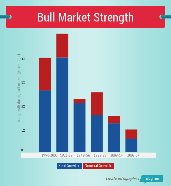 We should at least give the current market a little slack, though. We can already see that it trails the Reagan-era bull market on an equal-time comparison, but how much did the other megabulls actually grow during their first five years?