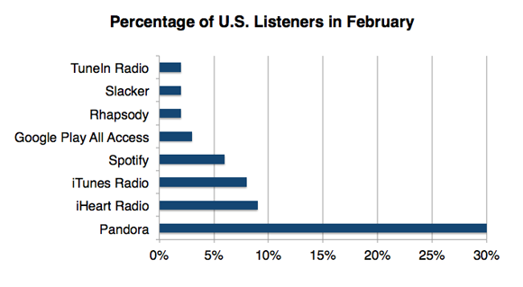 But not everything is rosy for Pandora. Though the company saw a 9% year-over-year increase in total listeners last month, it was Pandora's slowest growth to date. The company is also facing stiff competition from Apple's iTunes Radio. iTunes entered the market just six months ago and now nabbed 8% of the Internet radio listeners last month, taking the No. 3 spot behind iHeart Radio and Pandora.