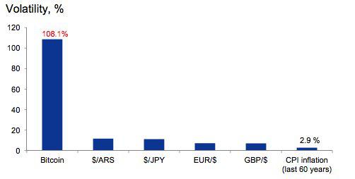 Meanwhile, the volatility that national currencies experience can usually only be felt in three ways -- traveling abroad, importing and exporting products, and long-term inflation. None of these price swings come anywhere close to Bitcoin's volatility, as illustrated in this chart from the aforementioned Goldman Sachs report on Bitcoin: