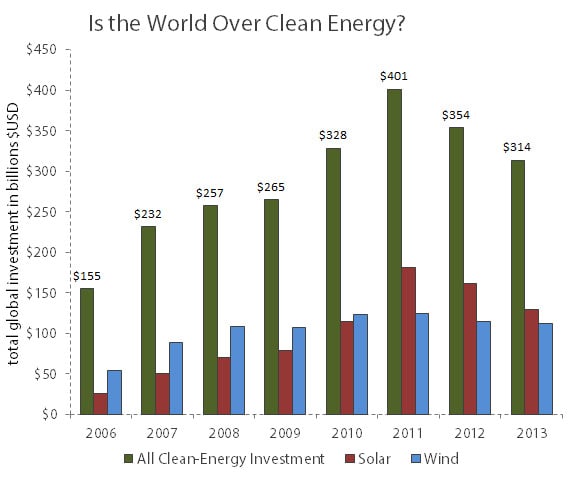 Solar and wind power, which have long been the two leading lights of renewable energy, each suffered similar declines as seen in the sector as a whole. Solar grew most impressively from 2006 to 2011 but saw 28% less investment flow in 2013 than it did during its peak year. Global wind energy investment is 10% below 2011's high, but that sector appears to have effectively leveled off, as 2013's investments were only 4% greater than 2008's.
