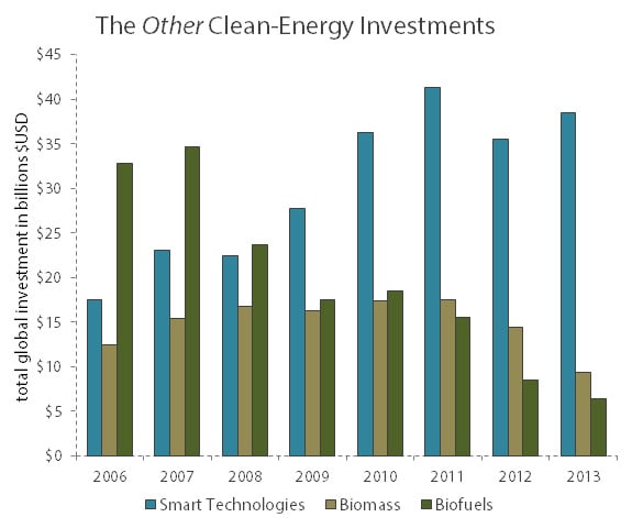 With total global investment of $38.5 billion in 2013, energy-smart technology, which is typically identified with the "smart grid" and with greater energy-use efficiencies through computerized control (Bloomberg also counts transportation and storage in this sector), is the best-performing clean-energy sector in the world outside solar. It's more than doubled its investment dollars since 2006, but even the smart grid isn't immune to investor burnout, as 2013's totals were 7% below the 2011 peak.