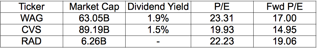 Rite Aid trades at a premium P/E versus both Walgreen and CVS, which is probably a reflection that investors expect the company to continue on the road to recovery over the coming years, and the company pays no dividends.