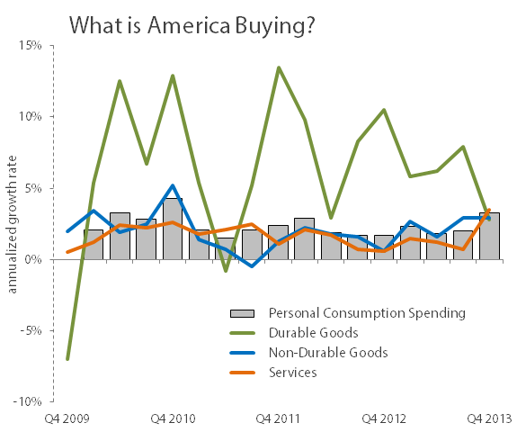 However, personal consumption was an important part of this quarterly upgrade. Key to that boost was a growth in U.S. services spending, which grew at its fastest rate in nearly a decade. You'd have to go back to 2005 to find a higher growth rate in services-related spending than the 3.5% recorded in the fourth quarter. This rise offsets a weakening in durable-goods spending, which is notoriously erratic: