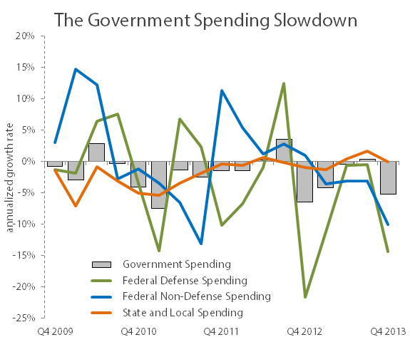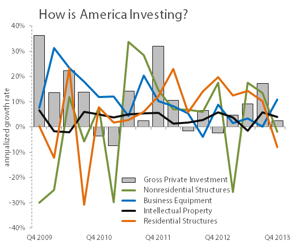This chart shows that growth of investment in residential structures is weaker than it's been since late 2010. This has been blamed on a bad winter, but keep in mind that the worst of this weather has largely taken place in 2014, so we might be in for another lousy quarter on this front. Nonresidential structure investment growth also tends to bottom out in the first quarter -- the two big dips on the chart above that took place following a return to growth were the first quarters of 2011 and 2013.