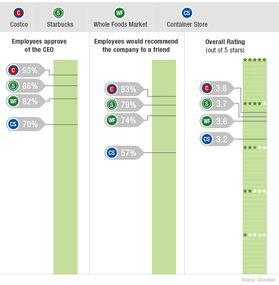 For a retail enterprise, The Container Store doesn't do badly. Employees like the CEO (Kip Tindell), a majority would recommend the company to a friend, and overall they give it 3.2 stars out of 5. In each category, it trails Amazon and Target, but does better than Wal-Mart, Bed Bath & Beyond, and Crate & Barrel. Still, given all the talk about employees, I'd expect better than middle of the pack.