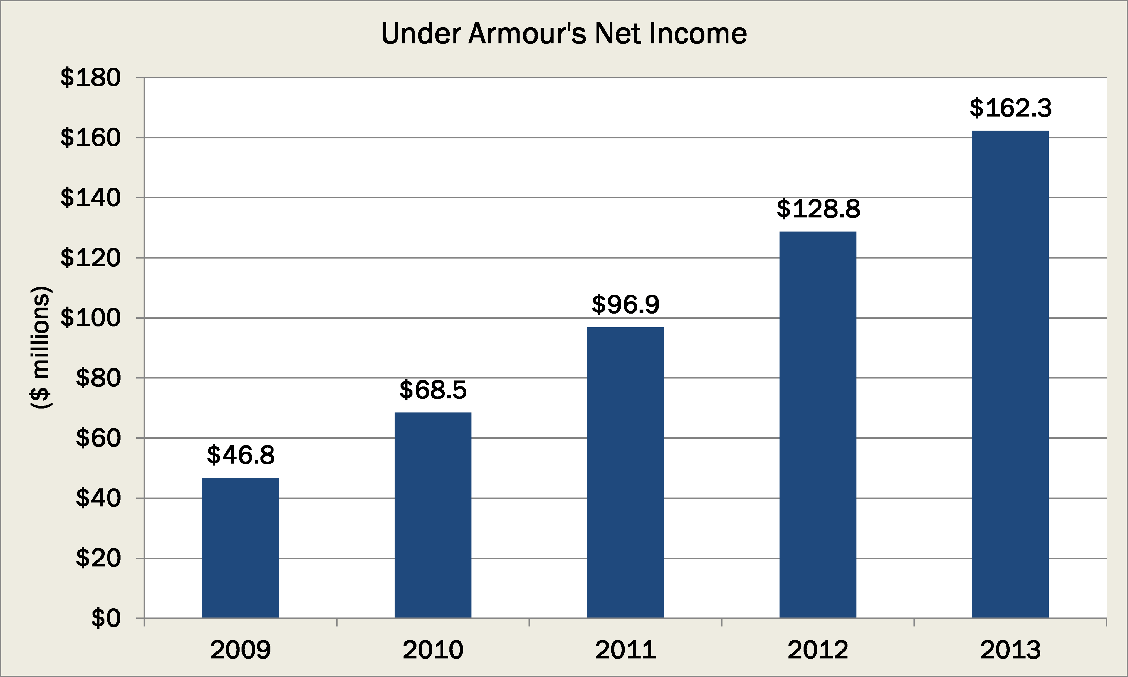 The bottom line at Under Armour over the last five years reveals it hasn't just been consistent in delivering strong earnings, but it's been consistent at significantly growing those earnings as well: