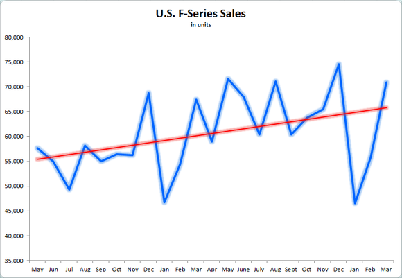 Ford considers any month when F-Series sales top 50,000 a solid month. That makes topping 70,000 in March a phenomenal month, and it's something that has only happened four times since the recession. That's great news for Ford's first-quarter profits -- sales of America's best-selling truck were up 5.1% in March, nearly reaching 71,000 units.