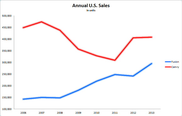 Granted, Ford increased its incentives by 32% on the Fusion, but I'd argue it was money well spent. Consider that in the most competitive auto segment, the Fusion and its aggressive styling reach an average transaction price of $23,500, which is above the Camry's and near the very top of this ultracompetitive category, according to Merkle. It should also be noted that even with the significant increase in incentives, the price still totals less than the average discount price in the midsized car segment. I nearly forgot to mention that the Fusion set an all-time monthly sales record in March of nearly 33,000 vehicles. Check out the narrowing gap between the leading Camry and the Fusion: